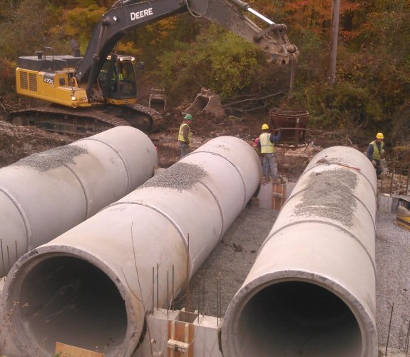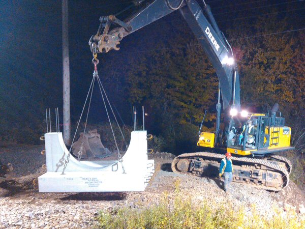 By combining precast segments with cast-in-place construction, VMS Construction successfully installed and backfilled three parallel 72" RCP pipes with headwalls during the mandated Railroad weekend shutdown period, working around the clock from Thursday to Sunday night. Tracks were re-installed Monday and re-opened to rail traffic. Remaining rip rap channels, cast-in-place work, safety railings and all final restoration work was completed over the following two weeks.
