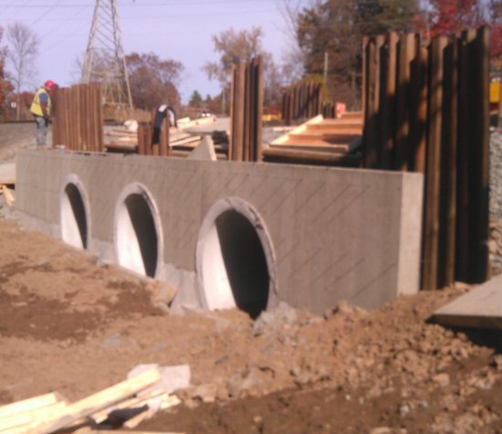 By combining precast segments with cast-in-place construction, VMS Construction successfully installed and backfilled three parallel 72" RCP pipes with headwalls during the mandated Railroad weekend shutdown period, working around the clock from Thursday to Sunday night. Tracks were re-installed Monday and re-opened to rail traffic. Remaining rip rap channels, cast-in-place work, safety railings and all final restoration work was completed over the following two weeks.